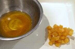 [2] 干しいもは5mmの長さに切ります。※(りんご酢、砂糖、塩こしょう、オリーブオイル)を混ぜ合わせ、マリネ液を作ります。