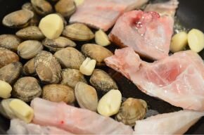 [3] フライパンにオリーブオイルを入れて、魚の皮目を下にして並べます。にんにくとアサリ貝を加え、火を点けます。