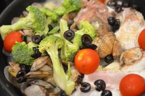 [4] 魚の皮目に焼き色がついたら返します。小房に分けたブロッコリー、ミニトマト、ブラックオリーブを入れます。純米酒と水を加え、味塩こしょうをふります。