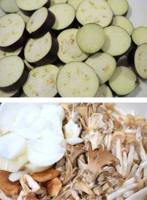 [1] なすはヘタを取り1cm厚みの輪切りに、しめじは下を切り落として1本ずつに分けます。しいたけは軸の先の硬い部分を切り落とし、軸も一緒に十字に切り、舞茸は手でさいて一口大にします。玉ねぎは皮をむいて半分に切り、芯を取り除いたら1cm幅のくし切りにします。
