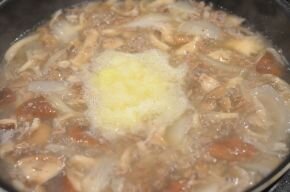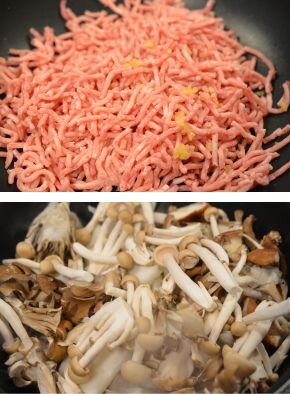 [2] 鍋に合いびき肉とにんにくを入れて火を点けます(油は入れません)。すぐにさわらず、ひき肉のまわりが白くなってきたら、きのこ類と玉ねぎを入れ全体を混ぜながら炒めます。3分ほど炒めたら水を入れて煮込みます。