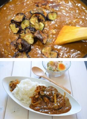 [5] 火を消し、カレールーを割り入れます。3分そのままにして、ヘラで底から全体をかきまぜながら溶かします。なすとしょうゆを入れ、全体を混ぜたあとご飯にかけて完成です。お好みで福神漬を添えてどうぞ。