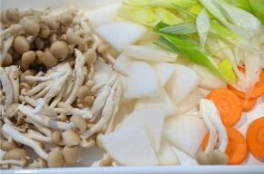 [1] しめじは下の部分を切り落とし2~3本ずつに分け、しいたけは軸の先のかたい部分を切り落として軸ごと十字に切ります。大根は皮付きのまま、5mm厚みに切り、いちょう切りにします。人参は皮付きのまま、5mm厚みの輪切りにします。白ネギは緑の部分と白い部分を切り分け、白い部分は1cm幅の斜め切りにします。