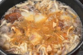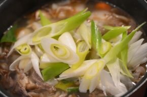 [5] 強火にして白ネギを入れ、白だしで味を調え出来上がりです。お椀によそい、お好みで七味唐がらしをふってお召し上がりください。