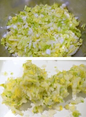 [1] ひき肉は調理30分前に冷蔵庫から出しておきます。白菜は横にして5mm幅に切ったら90度まわして5mm角に切ります。ボウルに入れ塩をふり全体にもみこみ、10分寝かせます。その後、出た水分をかたくしぼります。