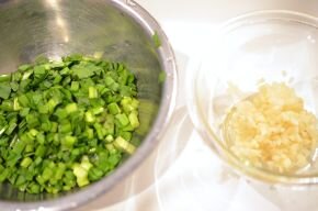 [2] ニラは5mmの長さに切ります。しょうがは皮を向き、1mm幅の千切りにして、1mmの長さに切ります(細かいみじん切りの感じで)。