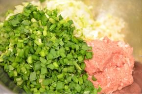 [4] [3]のボウルに白菜とニラを入れ、全体が均一になるように混ぜます。餃子の種の出来上がりです。冷蔵庫で20~30分寝かせます。