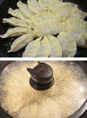 [7] フライパンの中央にキャノーラ油を入れます。餃子の底で油を広げながら並べたら火を点けて3分そのまま焼きます。熱湯(分量外)150ccを入れたら、フタをして強めの中火で5分焼きます。