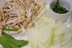 [2] 玉ねぎは皮をむいて半分に切り、芯を取り除いてから5mm幅のくし切りにします。しめじは下の部分を切り落とし、2~3本ずつに分けます。さやえんどうは、下ごしらえ「今更聞けないえんどうの筋の取り方」を参考に、筋を取り、大葉は丸めから千切りにします。