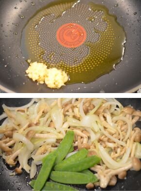 [4] フライパンにオリーブオイル、にんにくを入れ、火を点けます。にんにくをこがさないように弱火で香りが立つまで混ぜ、玉ねぎ、しめじを入れて炒めます。玉ねぎに火が通ったらさやえんどうを入れ、さらに炒めます。