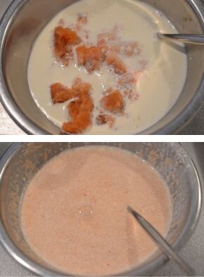 [3] 明太子を皮つきのまま包丁でたたいて細かく切ります。ボウルに入れ、生クリームを加えてよく混ぜ、明太子ソースを作ります。