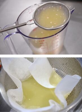 [3] 茶こし、またはざるにキッチンペーパーを敷き、果汁をこします。