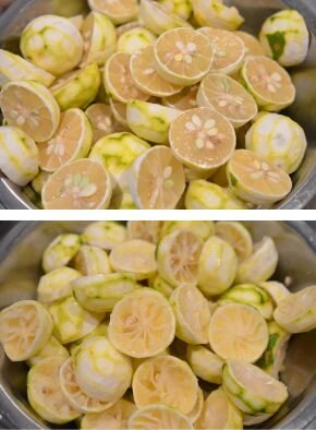 - ◆ ゆずは、青ゆずでも、黄ゆずでも、どちらでもよいです。ゆず:みりん:しょうゆを2:1:2の割合で用意しましょう。