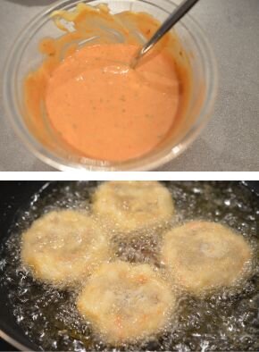 [5] ケチャップとマヨネーズ、レモン果汁を合わせ、オーロラソースを作ります。エビカツを170度の揚げ油に入れて両面を返しながら、きつね色になるまで揚げましょう。お好きな付け合せ野菜と一緒にお皿に盛り付けて、オーロラソースを添えたら完成です。