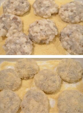 [4] バットにパン粉を入れ、[3]を8等分にします。小判型に丸めながらパン粉をまぶしたら冷蔵庫で30分寝かせます。