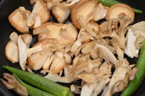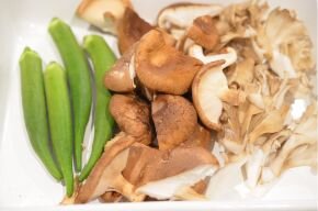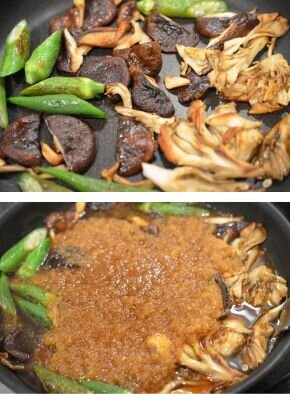 [2] フライパンにキャノーラ油を入れ、しいたけは傘の部分を上に向けて並べます。まいたけ、オクラも並べ、火を点けます。触らずにじっくり焼き目をつけます。※(しょうが、そうめんつゆ、みりん)を合わせて漬け汁を作ります。