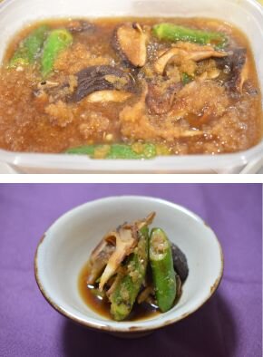[1] しいたけは軸先のかたい部分を切り落として軸も一緒に十字に切り、まいたけは手で一口大に裂きます。オクラはがくを包丁でぐるりと削ぎ落とし、しょうがと大根(皮がついた状態のまま)はそれぞれすりおろします。