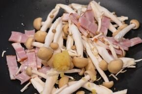 [2] 深めのフライパンにオリーブオイル、ベーコン、しめじ、にんにくを入れて、火を点けます。