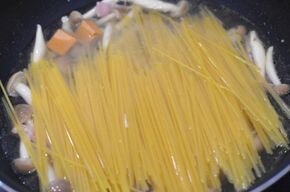 [3] しめじに火が通ったら、水とコンソメ、半分に折ったスパゲッティを入れます。フタをして弱火でスパゲッティの袋の規定の時間煮ます。