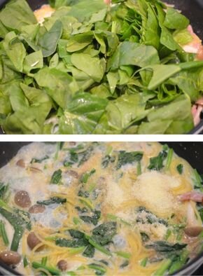 [4] 時間になったらフタを開け、ほうれん草と豆乳を加えて強火にします。全体を混ぜながら豆乳から細かい気泡が出始めたら火を止め、パルメザンチーズと味塩こしょうを加えて全体に混ぜて出来上がり。深めのお皿に盛り付け、スープをかけて完成です。