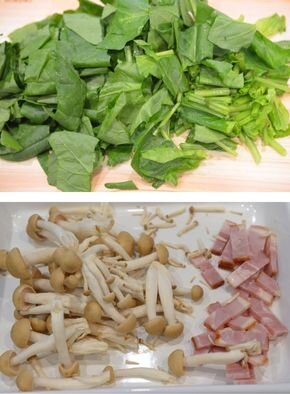[1] ほうれん草は4cm長さに、ベーコンは5mm幅に切り、しめじは根本を切り落とし1本ずつに分けます。