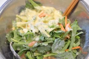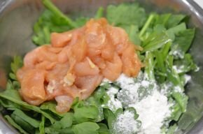 [3] 大きめのボウルに春菊、にんじん、鶏肉を入れて小麦粉を加え、全体にまぶします。