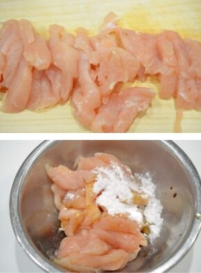 [1] 鶏肉は皮を取り除き、繊維を断ち切る方向に、1cm厚のそぎ切りにします。その後、並べて5mm~1cmの拍子切りにしたらボウルに入れ、日本酒、しょうゆ、片栗粉を加えてもみ込みます。