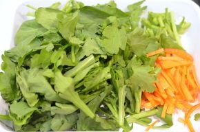 [2] 春菊は4cm長さに切り、にんじんは皮付きのままマッチ棒ぐらいの千切りにし、ゆずは皮の部分を細く切っておきます。