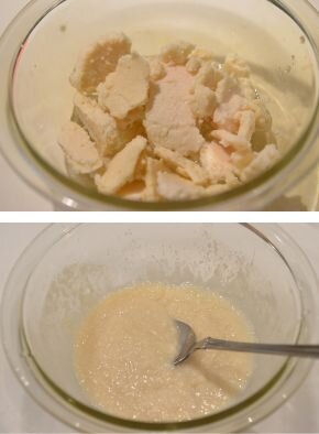 [1] 酒粕はほぐして耐熱容器に入れ、水大さじ2(分量外)を加えて電子レンジで1分加熱します。加熱後はスプーンで混ぜます。