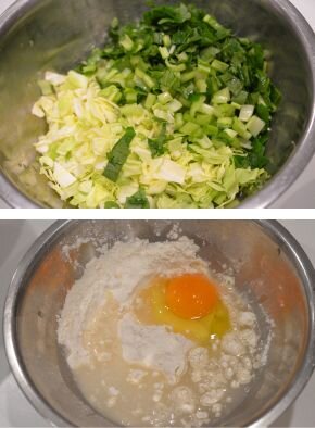[2] 小松菜は1cm長さに切り、キャベツは1cm角に刻んでボウルに入れます。別のボウルにお好み粉と卵、水を合わせて混ぜたら野菜が入ったボウルに加え、さらに混ぜ合わせてお好み焼きの生地を作ります。