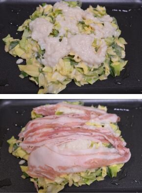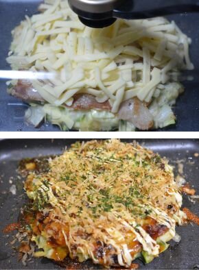 [5] フタを開け、豚肉の面が上になるようにもう一度返します。ホットプレートを保温にしてチーズを乗せて再びフタをし、溶けたら出来上がりです。お好みソース、マヨネーズ、かつおぶし、青のりをかけて完成です。