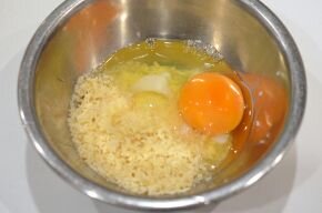 [1] 玉ねぎは皮をむいて芯も一緒にみじん切りにします。耐熱容器に入れてバターをのせ、電子レンジ(500W)で2分加熱したら、溶けたバターを全体に混ぜてから冷まします。パン粉に豆乳と卵を加え、全体を混ぜてふやかします。
