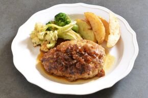 [6] お皿にハンバーグと付け合せ野菜を盛り、オニオンソースをかけたら完成です。