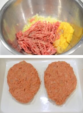 [2] ボウルに冷めた玉ねぎ、ふやかしたパン粉、合い挽きミンチ、味塩こしょうを入れて、白く粘りが出るまでよく混ぜながらこねます。楕円形に成形してバットに並べ、30分冷蔵庫で寝かせます。