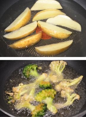 [3] その間に付け合わせ野菜とソースを作りましょう。じゃがいもは皮付きのままたわしで洗って水気を拭き取り、縦半分に切ってさらに縦4等分に切ります。野菜料理「究極のフライドポテト」を参考に、じゃがいもを揚げます。170度の揚げ油に、茎ブロッコリー、カリフローレを入れ、1分間揚げます。