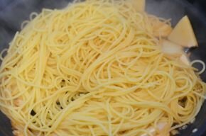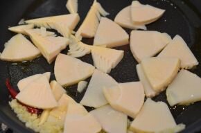 [3] スパゲッティが茹で上がり3分前になったら、にんにくが入っているフライパンに筍を入れて焼きます。