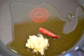 [2] 大きめの鍋にお湯を沸かして、塩(コツ・ポイント参考)を加え、スパゲッティを袋の規定の時間茹でます。フライパンにオリーブオイル、にんにく、鷹の爪を入れて火を点け、ふつふつしてきたら極弱火にしてにんにくを焦がさないようにオリーブオイルに香りをつけます。