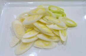 [1] 料理を始める30分前に、菜の花を「菜の花の下ごしらえ」を参考に水につけてから、半分に切ります。白ねぎは下の部分を切り落として斜め5mm幅に切り、※(酒、水、塩こしょう)を合わせて調味液を作ります。