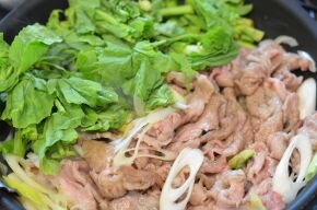 [4] 豚肉を返して白ねぎと混ぜ合わせたら、フライパンの片側を空けて菜の花を並べます。1分間焼いてから全体を混ぜ合わせます。